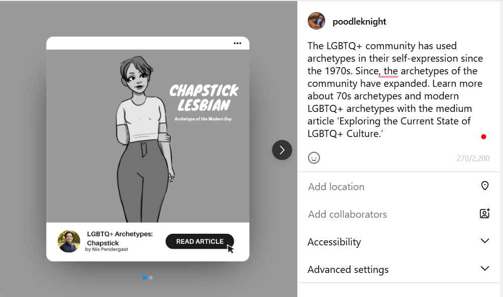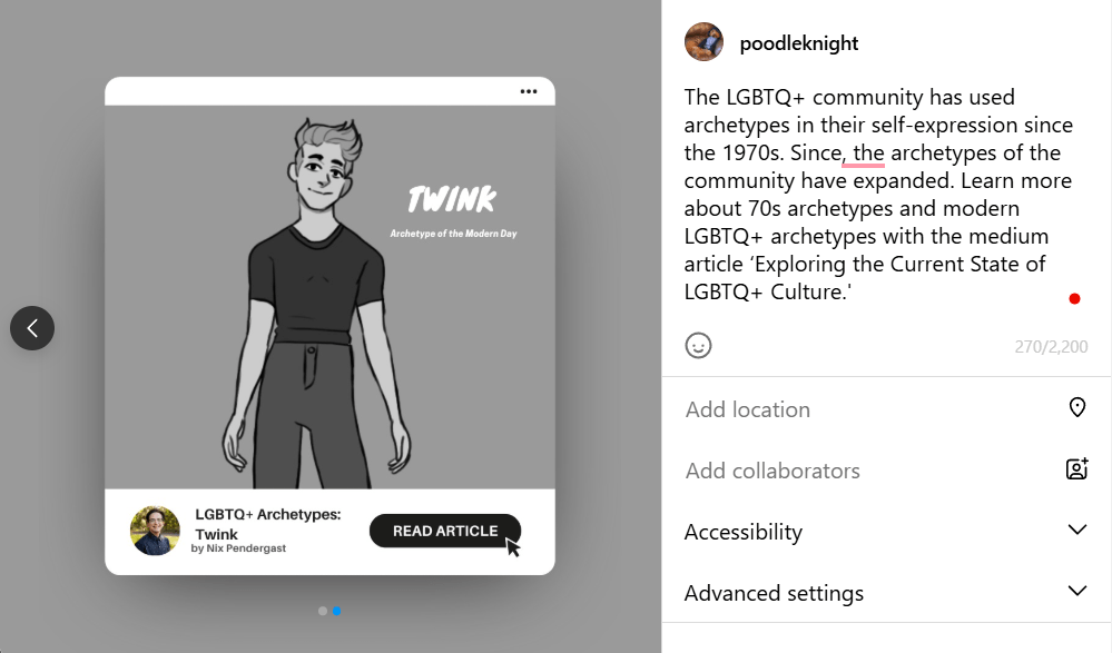 The topic of my article is on the past and current state of archetypes in LGBTQ+ culture. My article is graphic heavy, as it will showcase visual examples of the archetypes. I will use a Carousel slideshow on both Instagram and LinkedIn but will change each slideshow for that website. The text accompanying the slideshow will change as well.