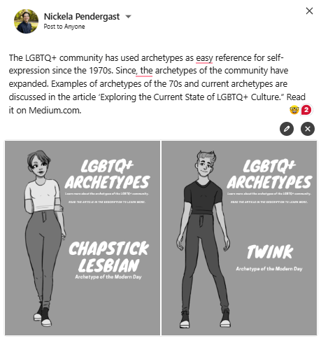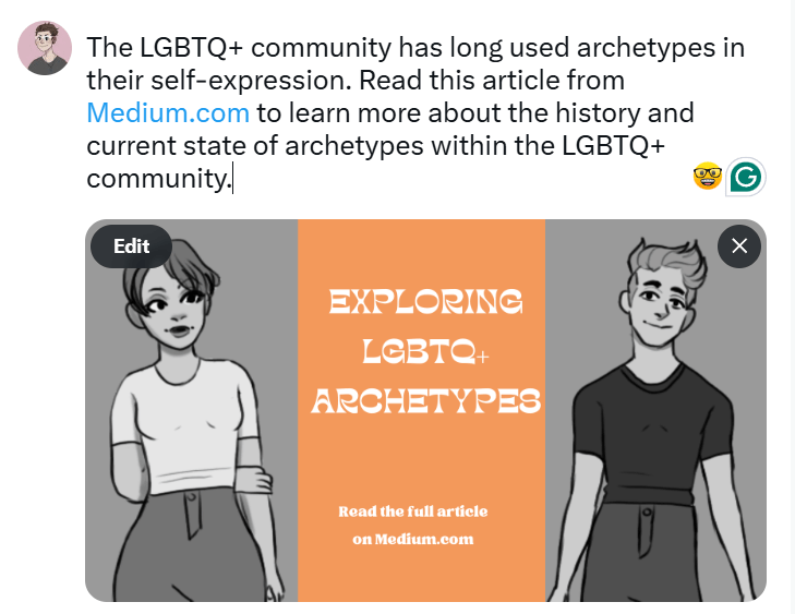 X has a 280-word character limit on posts for free users. So, there is not much space to give information about the article. Instead, the text along with the promo image will be a call to action to learn more about LGBTQ+ archetypes of the past and present. Like the prior two posts, the X post will have a link to the article and read: