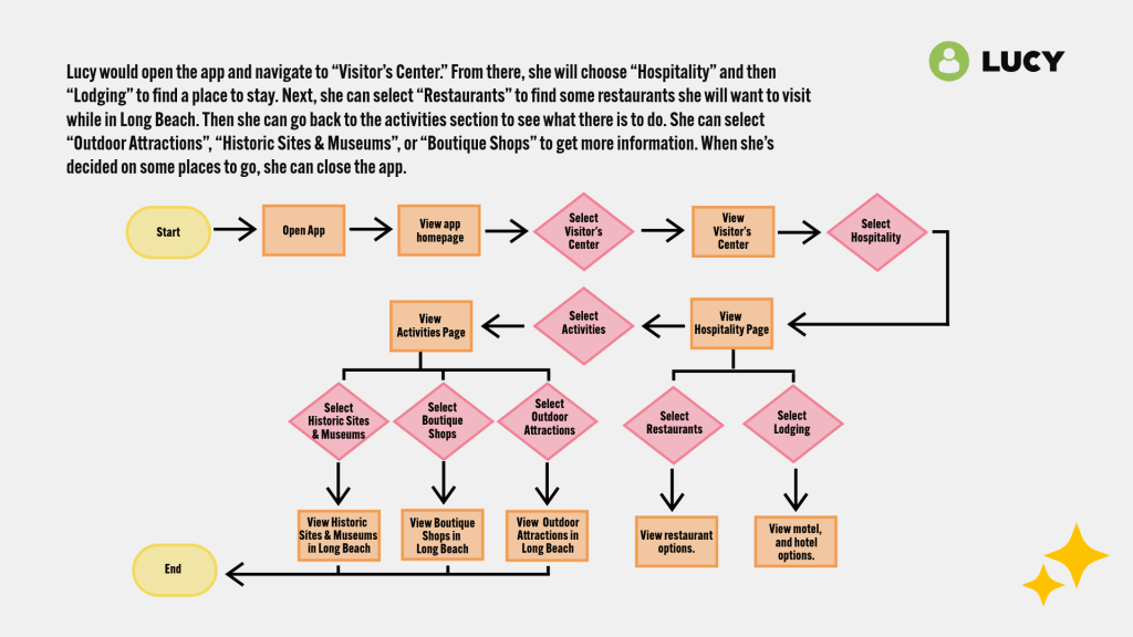 Lucy has the biggest flow chart, because she has the most do while in the app. The other users had one task, while she has three tasks to complete. The options in the app do make it easy for her to find the information she needs. Like Barbara’s flowchart, no changes had to be made to the app’s UI for Lucy to obtain her goal.