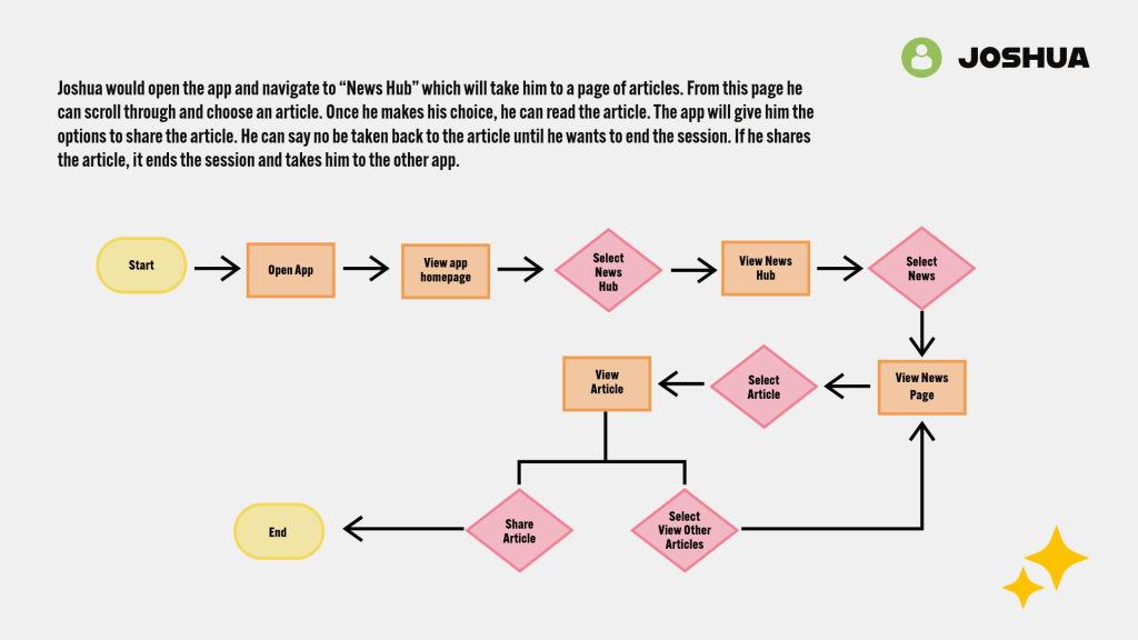 Joshua’s path on the site could potentially go for a long time, depending on how many articles he wants to read. So, his flowchart shows the path he would take to read an article, but to also go back and read more. In case he wants to come back to an article at a later point, the app gives the option to bookmark articles so the user can come back to it easily. Joshua’s flowchart did bring attention to a place where the app’s UI was lacking. At first, the News Hub page was lacking a proper “News” page to host the local articles. This had to be added to the app’s UI. Once it was, Joshua was able to achieve his goal.