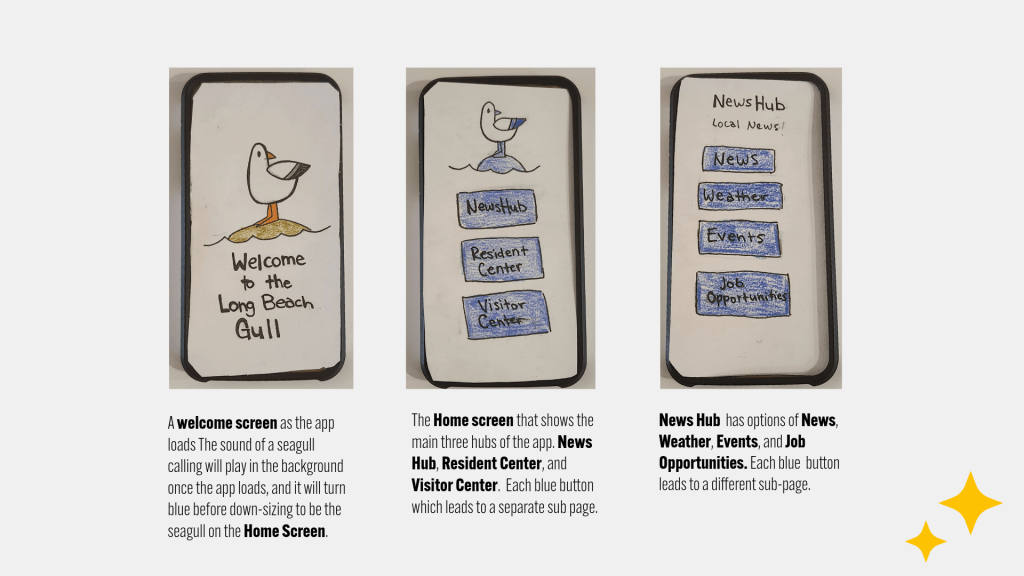 To work out possible problems with the Long Beach Gull, a paper prototype was created. The Long Beach Gull is a companion app for the Long Beach website, meant to provide resources for both the residents and visitors. The app architecture is based on the architecture of the Long Beach website but focuses on features that residents and visitors will both find useful.
