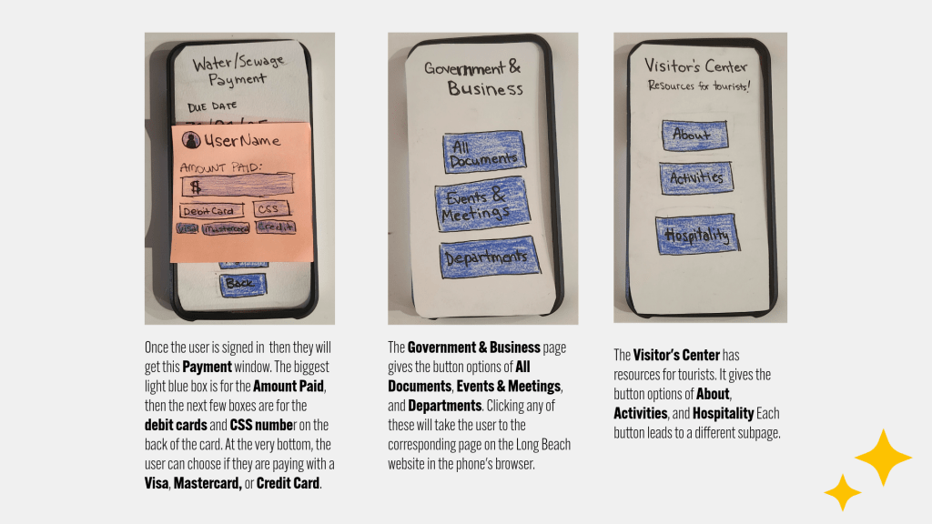 Prototypes are a useful tool to not only visualize a product, but to test the functionality. Depending on the needs of the stage of development of the product, there are different kinds of prototypes to use. For the expansion of the Long Beach Gull, a low fidelity model like a paper prototype worked well.