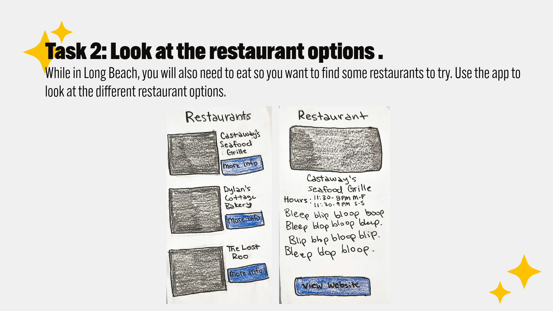 By combining both user and usability testing, it was possible to find that the current paper prototype of the Long Beach Gull app is functioning, as well bring attention to the areas of the Gull that could be more successful. Having two real people use the app to complete the intended tasks in the app showed that the current concept does work, as well as pointing out where the user’s experience could be made easier. A hybrid of both user and usability testing was used to successfully develop the Gull further to a place where a higher fidelity prototype could be created.
