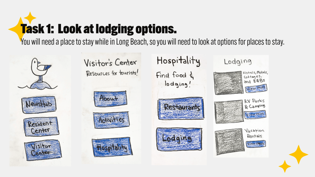 The Long Beach Gull (affectionately nicknamed the Gull) is a companion app to the Long Beach, Washington’s town municipal website. A paper prototype of the app was created, first using physical paper. The physical pages were then photographed and then put into a prototyping-on-paper (POP) app called Marvel to create a working digital POP. A link to the POP of the Gull was sent to two test-users. The users were chosen based on accessibility and familiarity with Long Beach. Both users who were tested were familiar with the city of Long Beach.