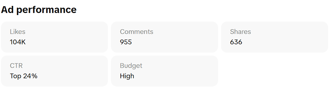 According to the 2025 Facebook Benchmarks, the average CTR for collectables is 4.13%, and the average CPC for collectibles and gifts is $0.34. Taking this average, it can be assumed that a total of $54.74 was spent on clicks. In the TikTok Creative Center, no specific budget is provided, but it is stated that the budget is “high.” The ‘Ad Performance’ section reports that the CTR is in the top 24%. While an exact CTR percentage is not provided, comparing metrics from the 2025 Facebook Benchmark supports the Creative Center’s results.