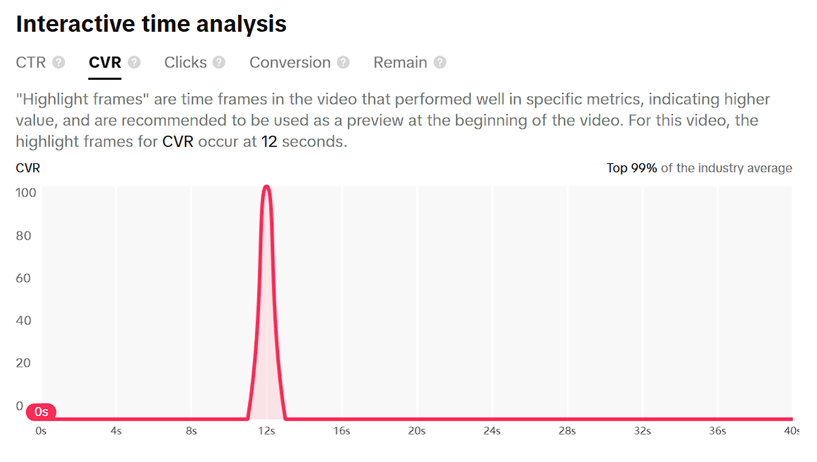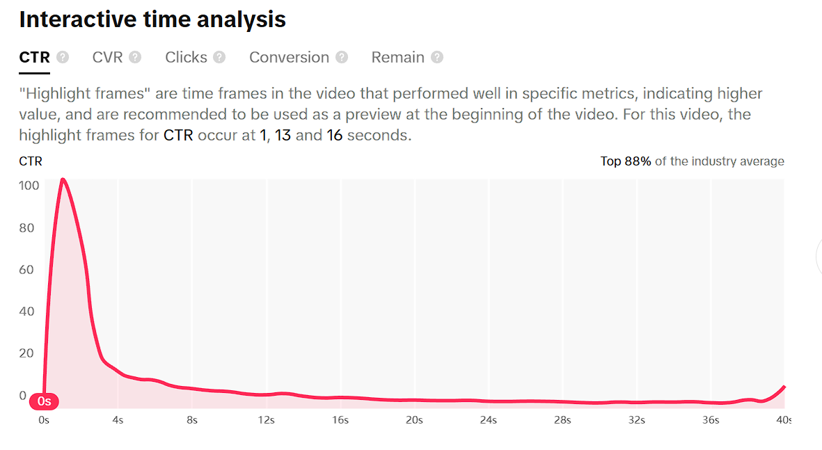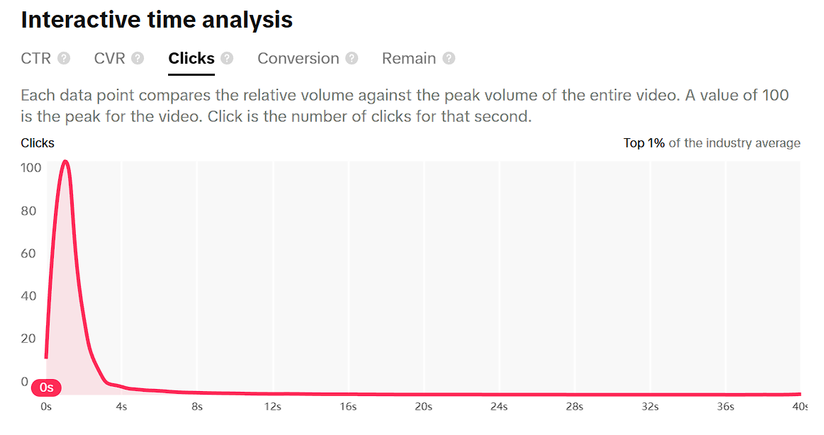 The click-through rate (CTR) for this ad peaks at 12 seconds in, with a total of 100 clicks; however, immediately after, it drops to 0. While a specific cost per click (CPC) was not provided, 100 clicks peaked within the first 4 seconds of the ad, and only 161 clicks occurred over the entire 40 seconds. All clicks occurred in the first 7 seconds of the ad. The TikTok Ad Creative Center also states that the points in the video that performed well on the metrics are at 1 second, 13 seconds, and 16 seconds. This ad also ranks in the top 88% of the industry average for CTR and in the top 1% for clicks, according to the ‘Interactive Ad Analysis’ section.