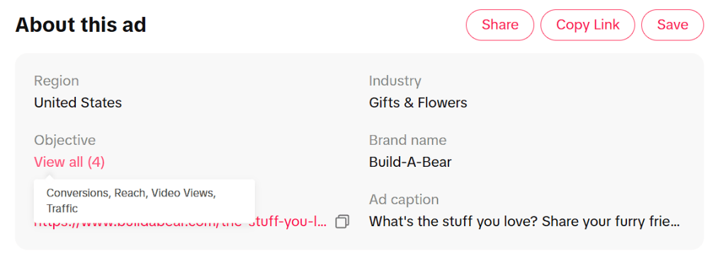 Previously, we analyzed the Build-A-Bear social media campaign to examine its strategies. This week, we continue this topic and will analyze one post to assess the ad’s effectiveness. The TikTok Creative Center was used to review a top-performing Build-A-Bear video ad.