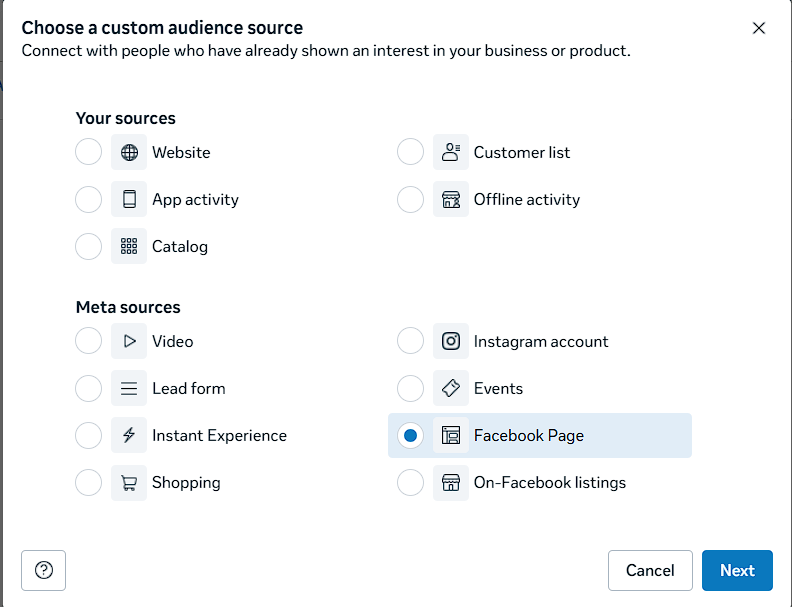 For a Daisy Doodle custom audience, the source must be the Daisy Doodle Facebook page itself. As for events that may allow an audience member to be targeted, there are a lot of options, but the events that would benefit Daisy Doodle the most are: