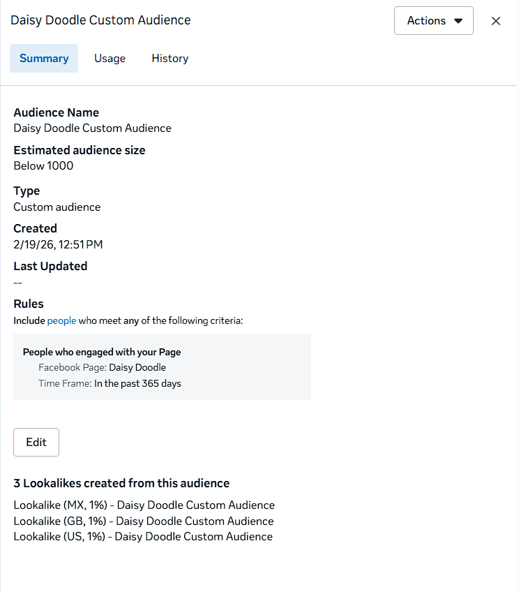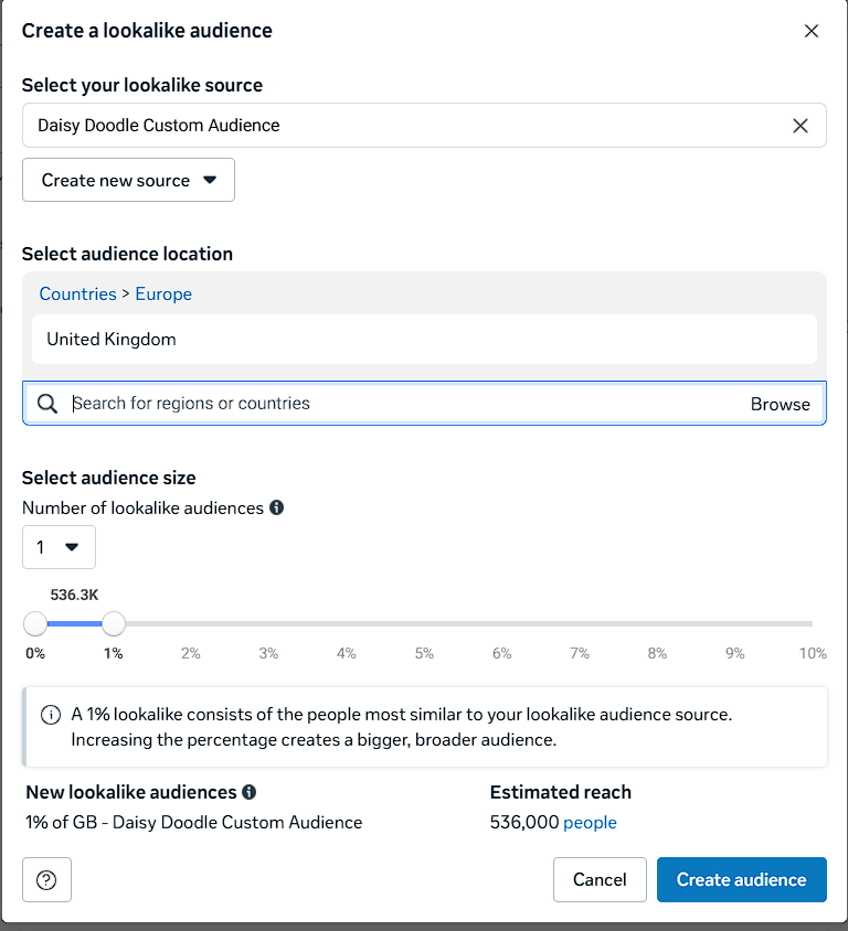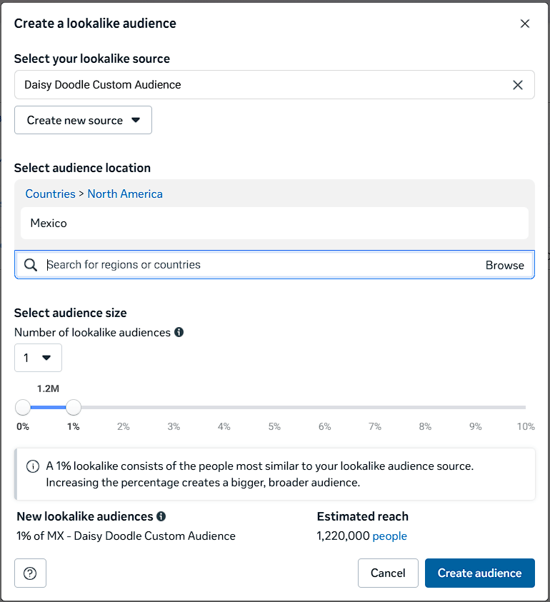 To target an audience in each country, a separate Lookalike Audience had to be set up for each one. For audience size, 1% is selected as suggested to get people most like the lookalike audience. This targets 2,780,000 people in the U.S., 536,000 in the U.K., and 1,220,000 in Mexico, totaling an estimated audience of 4,536,000. This shows that by targeting an audience outside the U.S., Daisy Doodle can expand brand awareness more than it would if its reach were limited to the U.S.
